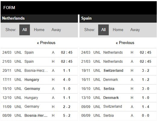 Thống kê phong độ Hà Lan vs Tây Ban Nha