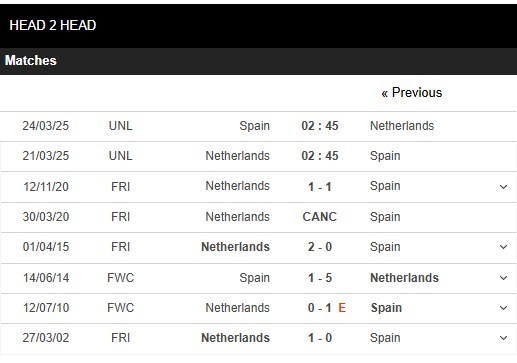 Thống kê đối đầu Hà Lan vs Tây Ban Nha