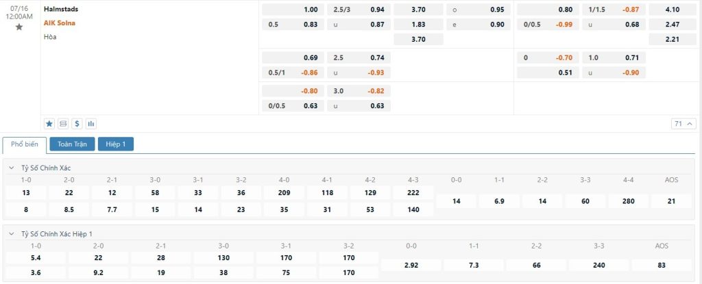 Xem tỷ lệ kèo cá cược bóng đá trực tuyến Halmstad vs AIK