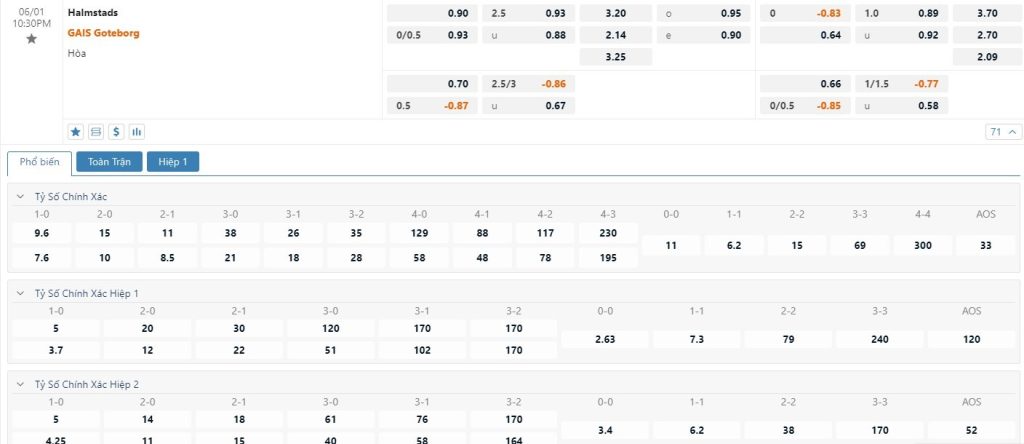 Tỷ lệ kèo cá cược bóng đá trực tuyến trận Halmstad vs GAIS