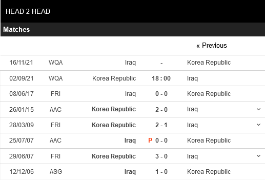 Thống kê đối đầu Hàn Quốc vs Iraq