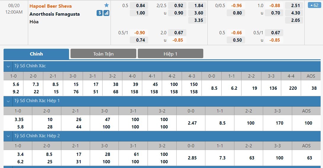 Tỷ lệ kèo cá cược bóng đá trận Hapoel Beer Sheva vs Anorthosis