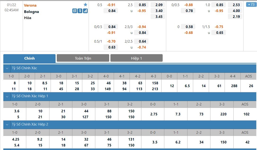 Tỷ lệ kèo cá cược bóng đá trực tuyến trận Hellas Verona vs Bologna