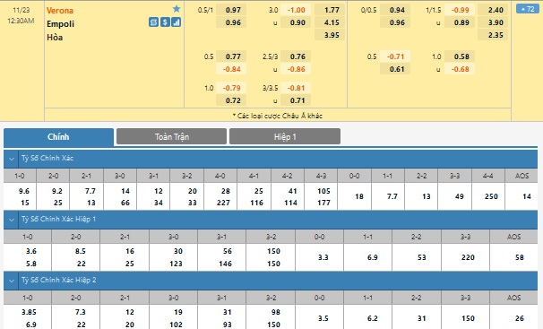Xem tỉ lệ kèo cá cược bóng đá trực tuyến Hellas Verona vs Empoli