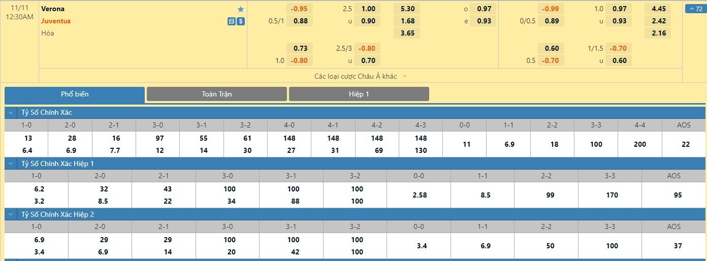 Xem tỷ lệ kèo cá cược bóng đá trực tuyến Hellas Verona vs Juventus