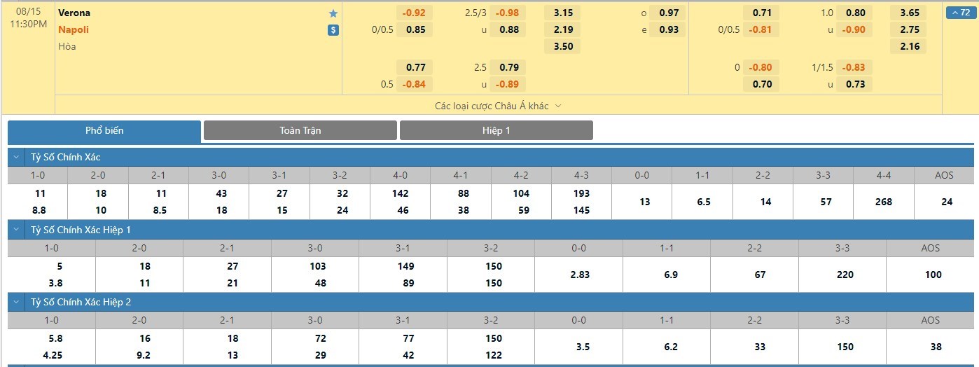 Tỷ lệ kèo cá cược bóng đá trực tuyến trận Hellas Verona vs Napoli