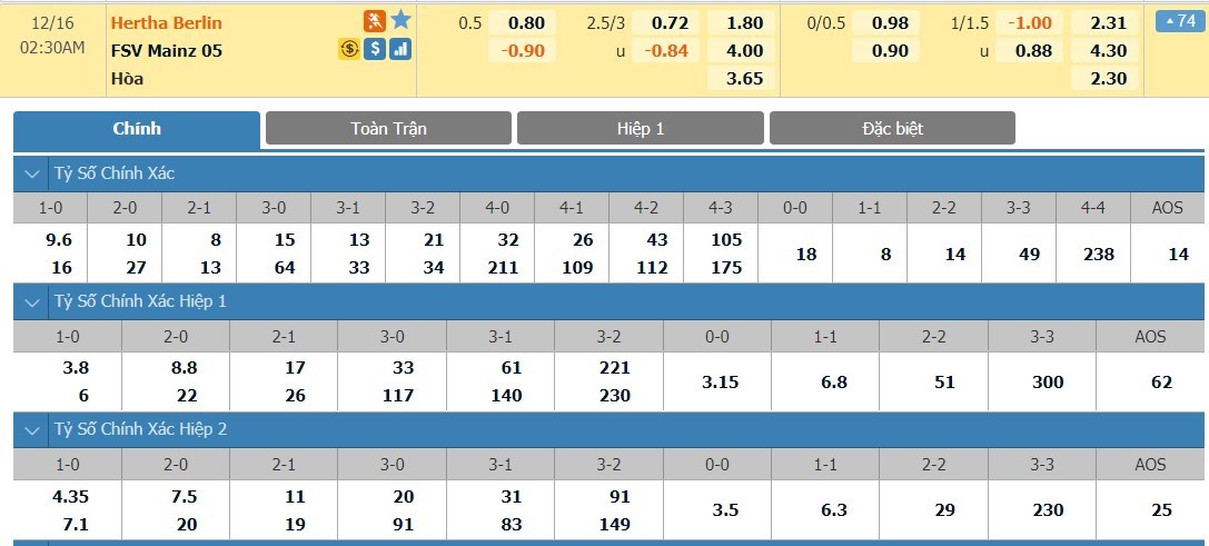 Tỷ lệ kèo cá cược bóng đá trực tuyến trận Hertha Berlin vs Mainz 05