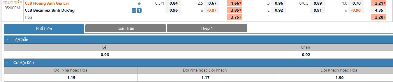 Tỷ lệ kèo cá cược bóng đá trực tuyến trận Hoàng Anh Gia Lai vs Bình Dương