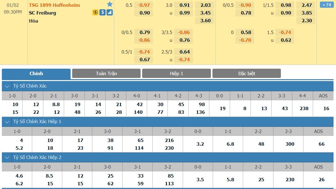 Xem tỷ lệ kèo cá cược bóng đá trực tuyến Hoffenheim vs Freiburg