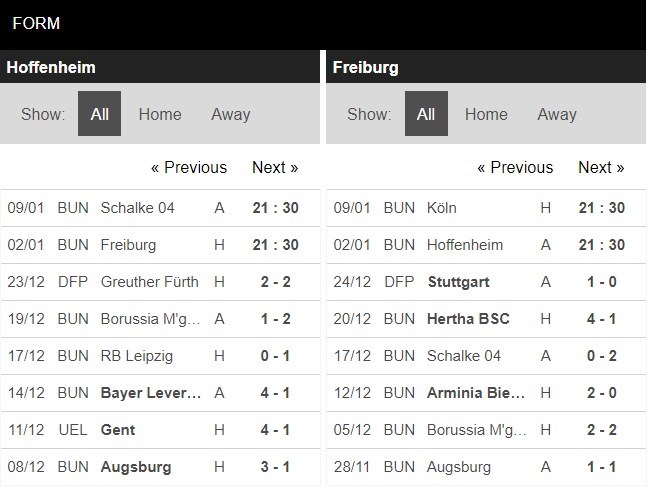 Trong khuôn khổ lượt trận thứ 14 Bundesliga, Hoffenheim sẽ có màn đón tiếp Freiburg tại sân nhà. Trước khi bước vào trận đấu này, Hoffenheim đã phải vô cùng vất vả trong trận đấu gặp Furth tại cúp Quốc gia Đức. Họ để đối thủ chiếu dưới cầm hòa 2-2 trong 120 phút thi đấu của thời gian chính thức và hiệp phụ. Hoffenheim buộc phải bước vào loạt sút luân lưu cân não. Tại đây, Hoffenheim đã để thua với tỷ số 6-7. Trở về Bundesliga, với 15 điểm, đội bóng này tụt xuống vị trí thứ 12 trên BXH cùng với 15 điểm sau 13 vòng. Đây không phải khoảng cách an toàn với nhóm cầm đèn đỏ khi họ chỉ hơn vị trí thứ 16 có 5 điểm nữa mà thôi. Ở đấu trường Châu Âu mà cụ thể là UEFA Europa League, Hoffenheim có vé vào vòng trong khi đứng đầu vòng bảng.