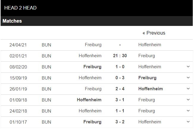 Thống kê đối đầu Hoffenheim vs Freiburg