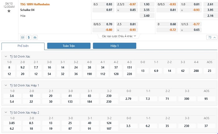 Tỷ lệ kèo cá cược bóng đá trực tuyến trận Hoffenheim vs Schalke 04