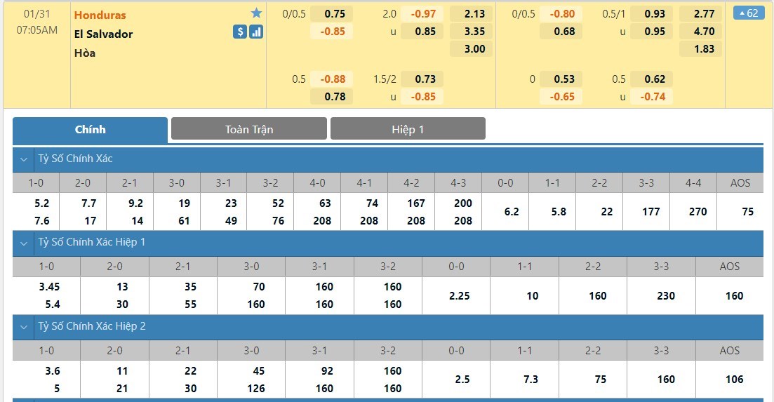 Tỷ lệ kèo cá cược bóng đá trực tuyến trận Honduras vs El Salvador