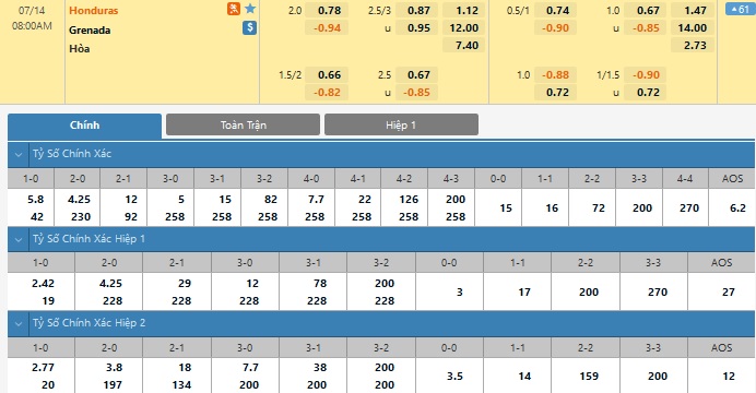 Xem tỉ lệ kèo cá cược bóng đá trực tuyến Honduras vs Grenada