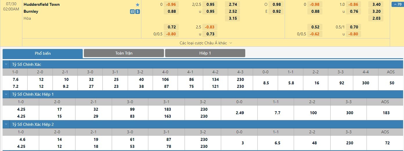 Xem tỷ lệ kèo cá cược bóng đá trực tuyến Huddersfield vs Burnley