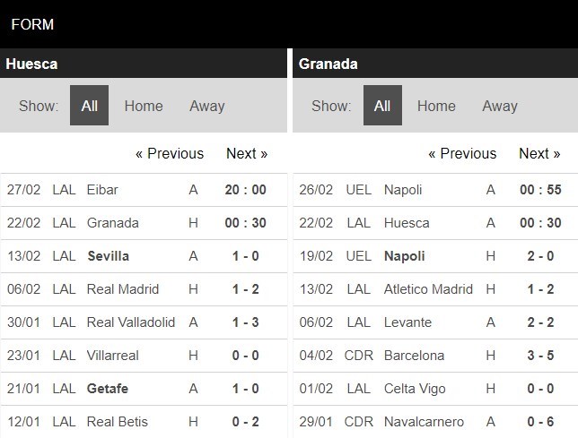 Huesca sẽ trở lại sân nhà của mình để có cuộc tiếp đón đối với đối thủ Granada CF trong khuôn khổ vòng 24 giải VĐQG Tây Ban Nha năm nay. Huesca dù rất cố gắng nhưng lại tiếp tục thua Sevilla với tỷ số tối thiểu ở lượt trận vừa qua. Trắng tay rời Sanchez Pizjuan, đội bóng này thua trận thứ 2 liên tiếp và thứ 11 kể từ đầu mùa. Hiện tại, họ đứng cuối cùng BXH cùng 16 điểm. Cách biệt giữa Huesca và vị trí an toàn gần nhất tiếp tục bị nới rộng lên thành 5 điểm. Hy vọng trụ hạng chưa hẳn đã hết nhưng nếu cứ chơi với phong độ nhạt nhòa như hiện này thì xem chừng sẽ rất khó để Huesca bám trụ lại đấu trường La Liga.