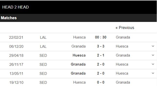 Thống kê đối đầu Huesca vs Granada