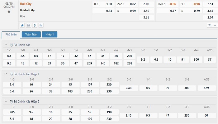 Tỷ lệ kèo cá cược bóng đá trực tuyến trận Hull City vs Bristol City