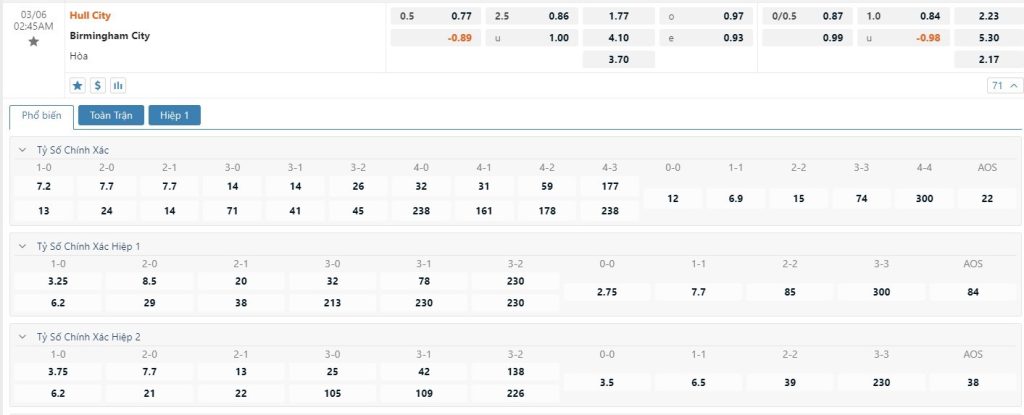 Tỷ lệ kèo cá cược bóng đá trực tuyến trận Hull vs Birmingham