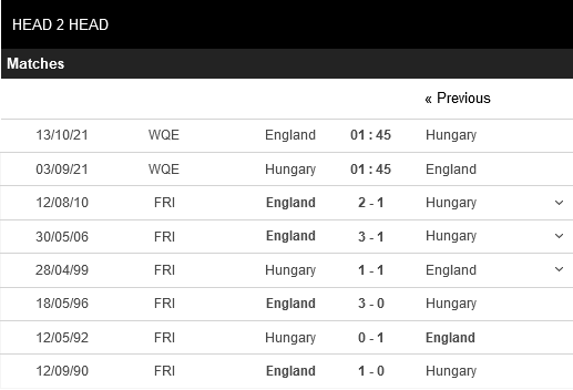Thống kê đối đầu Hungary vs Anh