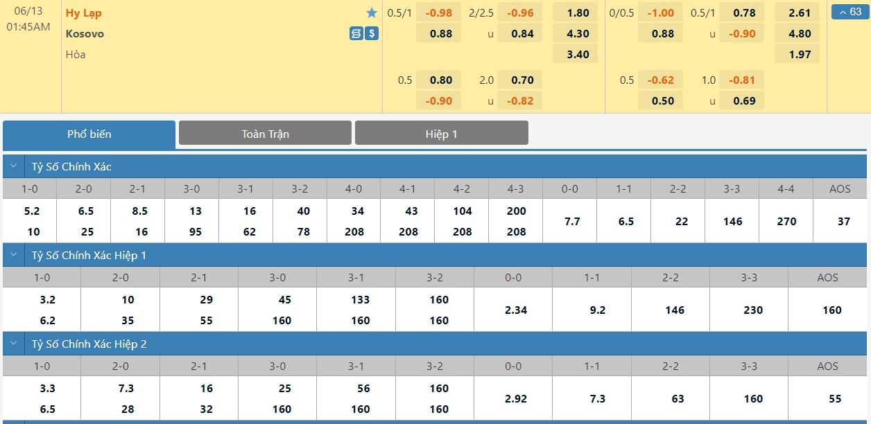 Tỷ lệ kèo cá cược bóng đá trực tuyến trận Hy Lạp vs Kosovo