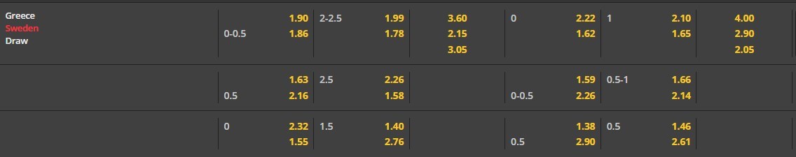 Tỷ lệ kèo cá cược bóng đá trận Hy Lạp vs Thụy Điển