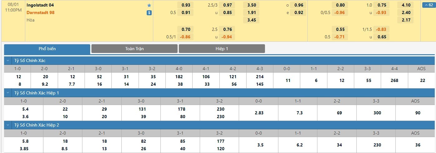 Xem tỷ lệ kèo cá cược bóng đá trực tuyến Ingolstadt vs Darmstadt