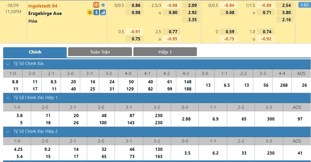 Tỷ lệ kèo cá cược bóng đá trực tuyến trận Ingolstadt vs Erzgebirge Aue