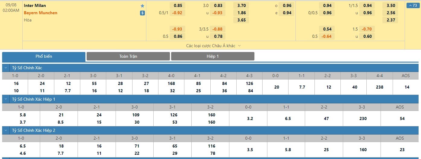 Xem tỷ lệ kèo cá cược bóng đá trực tuyến Inter Milan vs Bayern Munich