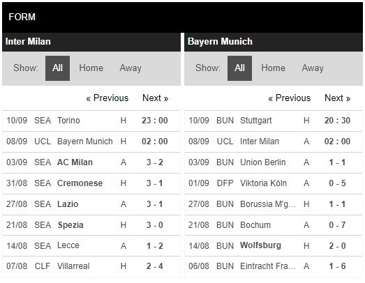 Thống kê phong độ Inter Milan vs Bayern Munich
