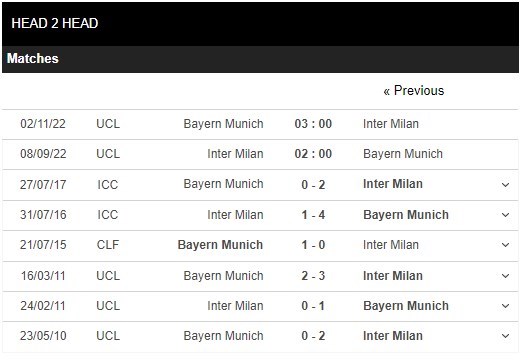 Thống kê đối đầu Inter Milan vs Bayern Munich