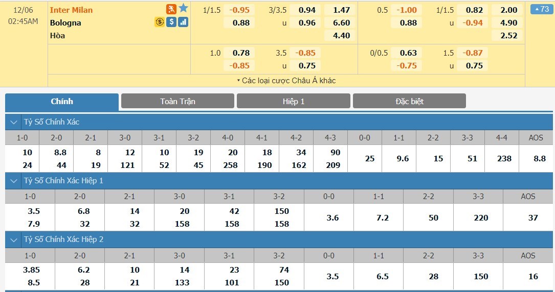 Xem tỷ lệ kèo cá cược bóng đá trực tuyến Inter Milan vs Bologna