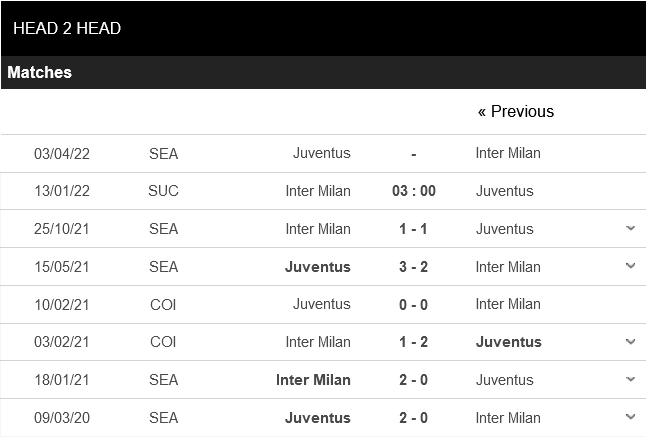 Thống kê đối đầu Inter Milan vs Juventus
