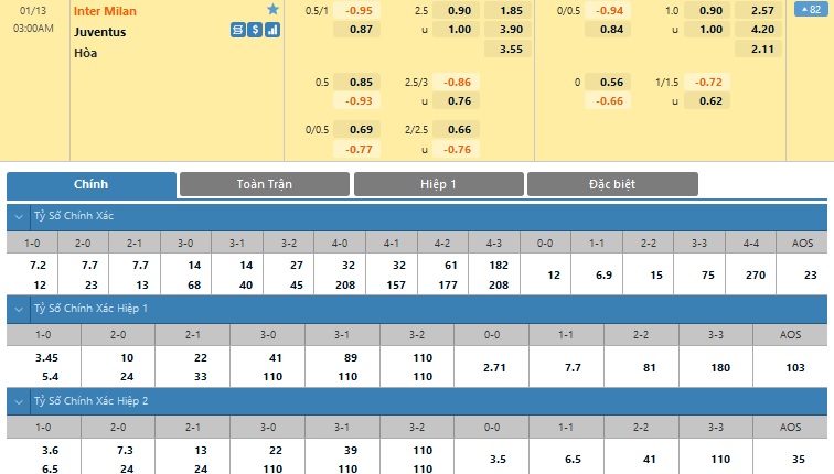Xem tỷ lệ kèo cá cược bóng đá trực tuyến Inter Milan vs Juventus