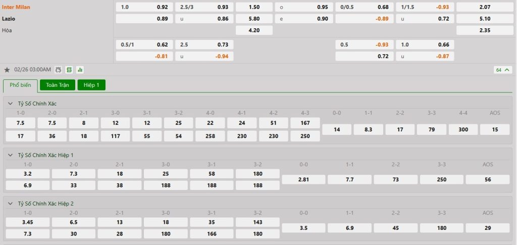 Tỷ lệ kèo cá cược bóng đá trực tuyến trận Inter Milan vs Lazio