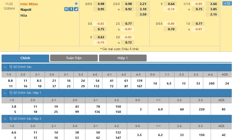 Xem tỷ lệ kèo cá cược bóng đá trực tuyến Inter Milan vs Napoli