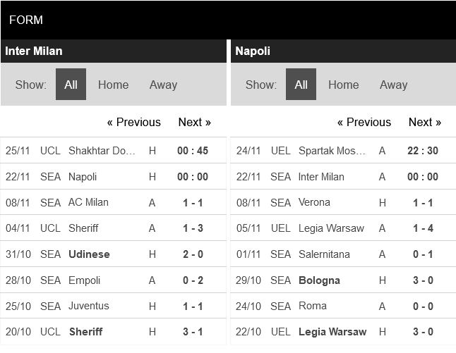 Thống kê phong độ Inter Milan vs Napoli