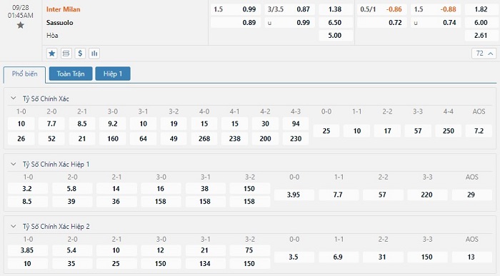 Xem tỷ lệ kèo cá cược bóng đá trực tuyến Inter Milan vs Sassuolo