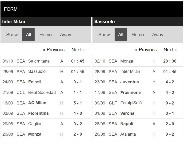 Thống kê phong độ Inter Milan vs Sassuolo