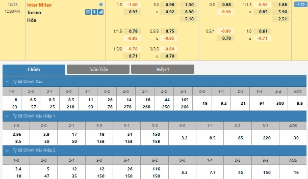 Xem tỉ lệ kèo cá cược bóng đá trực tuyến Inter Milan vs Torino