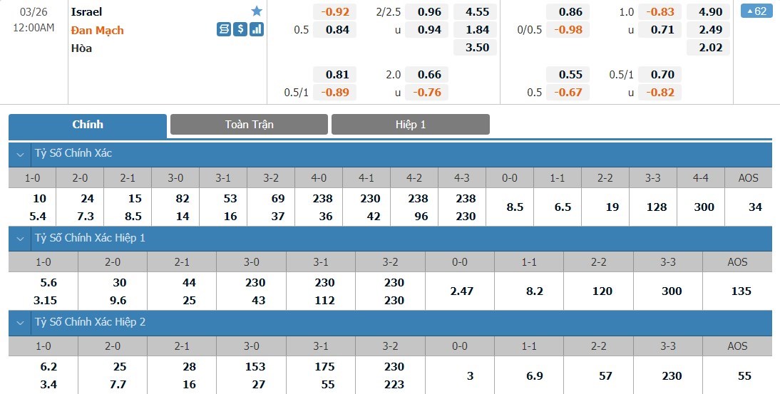 Xem tỷ lệ kèo cá cược bóng đá trực tuyến Israel vs Đan Mạch