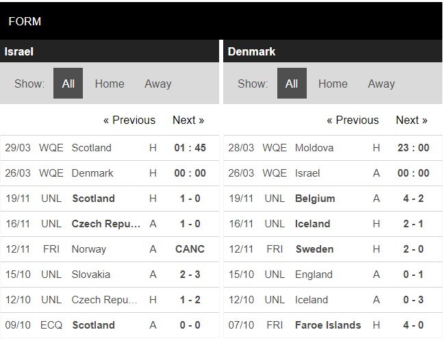 Ở lượt trận đầu tiên tại bảng F khuôn khổ vòng loại Châu Âu, Israel sẽ bước vào cuộc chiến đầy cam go với Đan Mạch. Thời gian qua, khó có thể nói rằng Israel đang chơi với một phong độ tốt. Bởi sau tổng số 10 trận đã tham dự, Israel mới chỉ giành được 3 chiến thắng, còn lại họ thua 4 và hòa 3. Tại mặt trận sân nhà, 3/4 màn đón tiếp gần đây Israel cũng đều toàn hòa và thua trong sự thất vọng của người hâm mộ trong đó hàng công của họ đều chưa từng ghi nổi quá 1 bàn. Vậy thì rõ ràng, Israel không được giới chuyên môn đánh giá cao ở lượt trận ra quân lần này không có gì là bất ngờ.