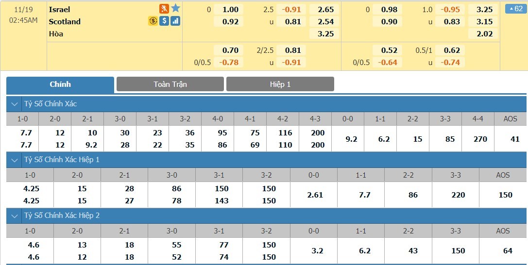 Tỷ lệ kèo cá cược bóng đá trận Israel vs Scotland