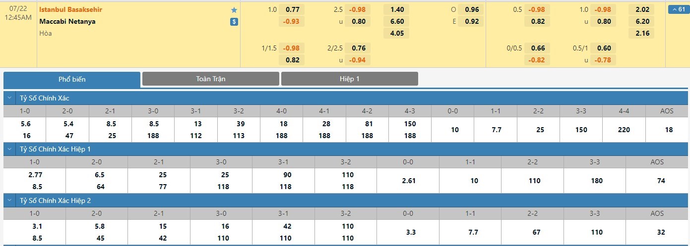 Tỷ lệ kèo cá cược bóng đá trực tuyến trận Istanbul Basaksehir vs Maccabi Netanya
