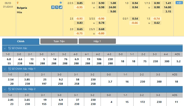 Xem tỉ lệ kèo cá cược bóng đá trực tuyến Italia vs Bulgaria