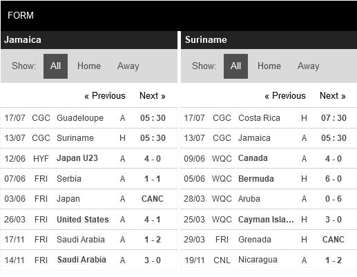 Trong khi đó, Suriname đã thua 4 trận gần nhất gặp Jamaica. Khó có thể xảy ra kết quả nào khác ở trận đấu tới dù rằng đây mới chỉ là lần đầu tiên họ gặp gỡ trong khuôn khổ Gold Cup.