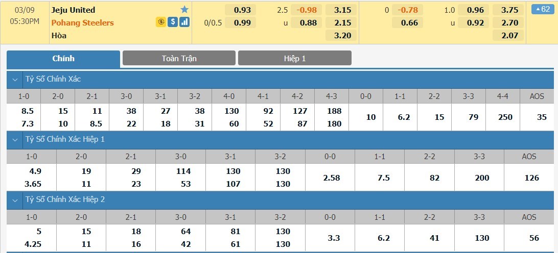 Tỷ lệ kèo cá cược bóng đá trận Jeju United vs Pohang Steelers
