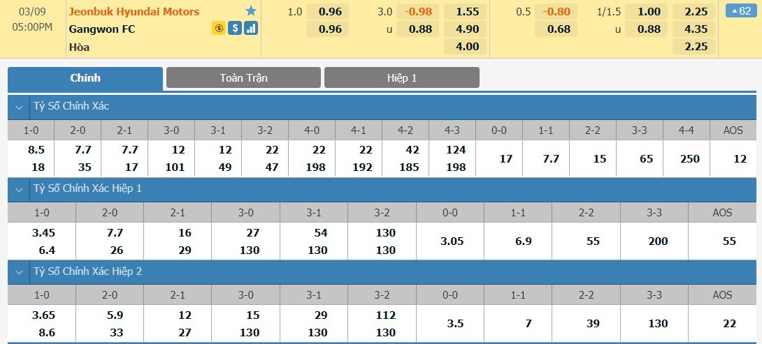 Tỷ lệ kèo cá cược bóng đá trận Jeonbuk FC vs Gangwon FC