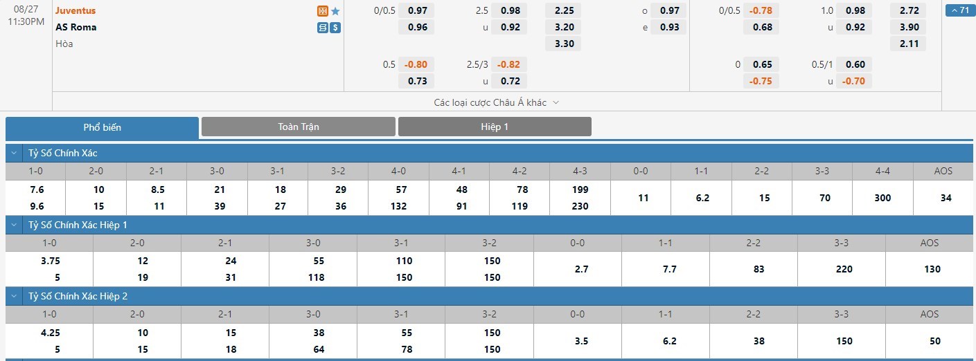 Tỷ lệ kèo cá cược bóng đá trận Juventus vs AS Roma