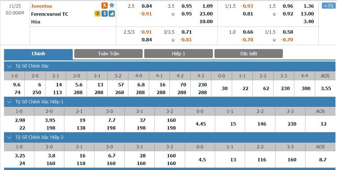 Tỷ lệ kèo cá cược bóng đá trực tuyến trận Juventus vs Ferencvárosi